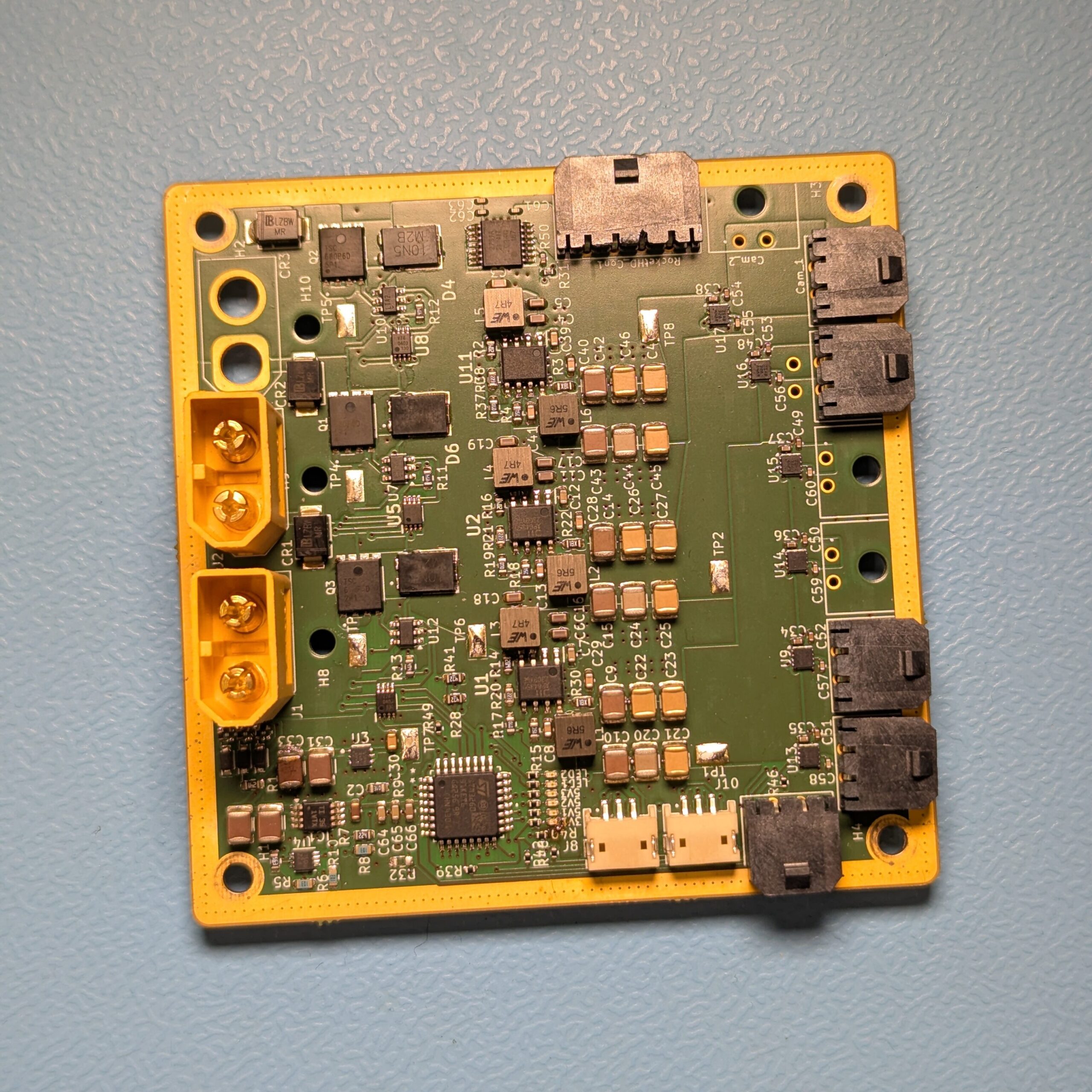 The power supply connects to two 4s2p LiIon batteries (main and backup) and distributes the power to all different systems using isolated power rails. The power supply board constantly monitors current, voltage, and temperature of the two batteries and is able to quickly switch to the backup if measurements exceed specifications.